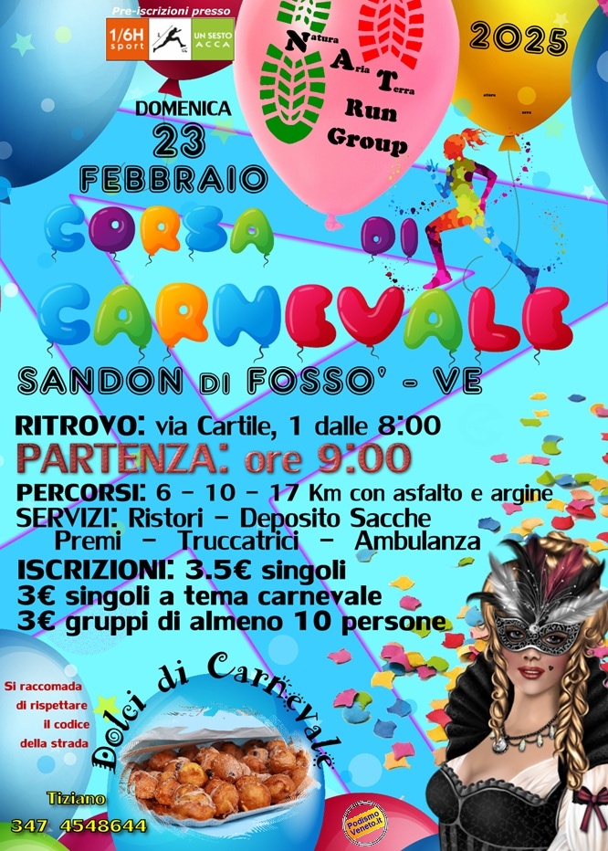 Domenica 23 febbraio – Corsa/camminata non competitiva su tre percorsi di 6 km, 10 km e 17 km con partenza ore 9:00. Ritrovo via Cartile 1 ore 8:00