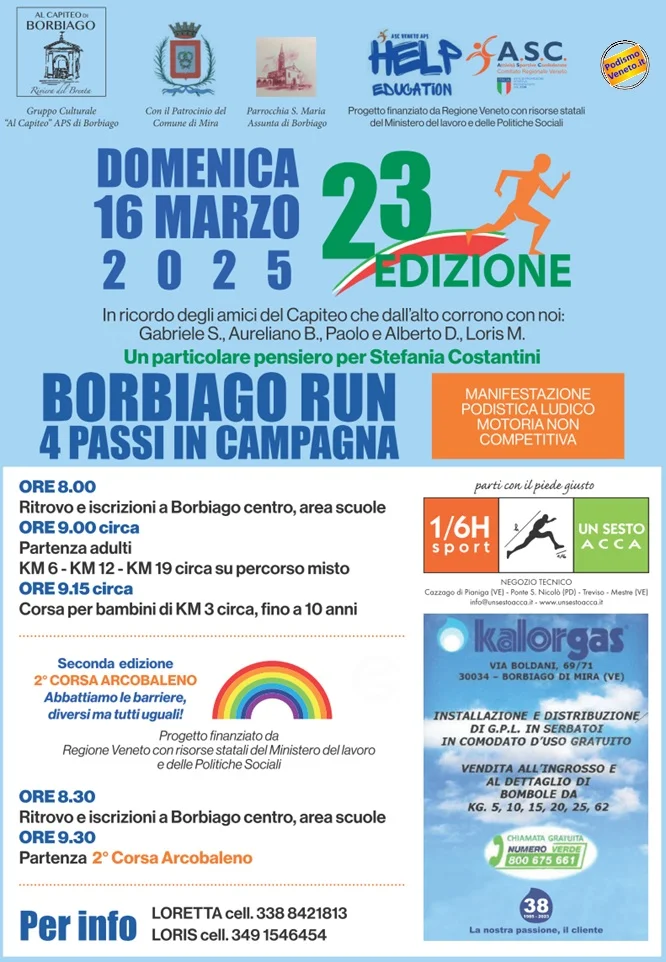 Domenica 16 marzo – Corsa/camminata non competitiva su quattro percorsi di 3 km (per bambini), 6 km, 12 km e 19 km con partenza ore 9:00. Ritrovo via Pisa ore 8:00