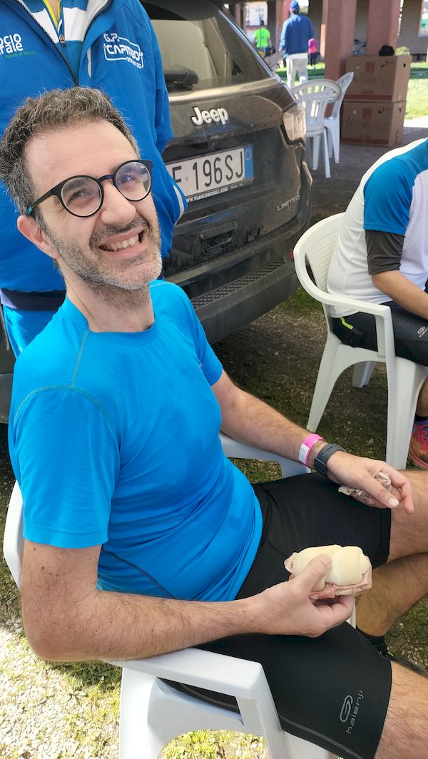 gnocchi) e via alla vestizione. Oggi assenze di lusso quella del Maestro Vittorio e del Pupillo (il primo impegnato con le pulizie domestiche il secondo impegnato nella mezza di Portogruaro in compagnia del Gianni e di Marigrazia. Come tradizione tre i possibili percorsi di 5 km per giovani, 12 km e 19 km. Partenza dei 12 km e dei 19 km prevista per le 9:00. Annunciati come presenti poco meno di 2000 partecipanti. Tracciati che, a parte nel primo e nell’ultimo tratto (asfaltati), si sono sviluppati lungo gli splendidi sentieri sterrati del Montello tutti ben percorribili pur se caratterizzati da un continuo variare delle pendenze che, anche se non impegnative, hanno creato più di qualche difficoltà ai nostri. Ristoro finale all’altezza della situazione con panini, dolci vari, mortazza e formaggio. Voto alla corsa e all’organizzazione 9. Alla prossima.