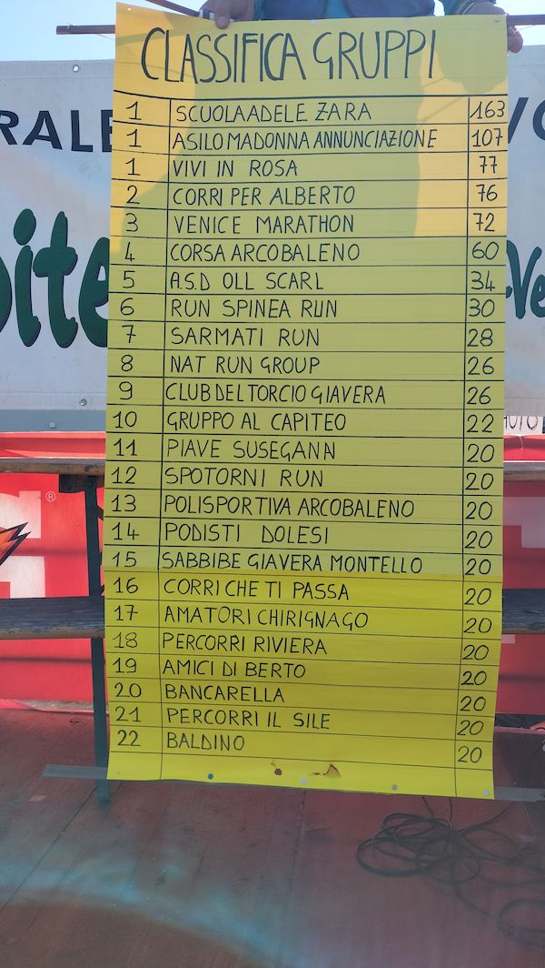 Domenica 9 novembre e tradizionale appuntamento podistico in quel di Giavera del Montello (TV) dove è andata in scena la 43°ma edizione della “Corsa della salute”, non competitiva organizzata dal gruppo podistico Sa.Bi.Be. Ritrovo di gruppo ore 7:30 a Borbiago con presenti Andrea, il Gianni con Tecla, Fabio. Direttamente in loco si aggregano il maestro Vittorio con Cristina e Carlo. Meteo che propone una giornata ideale con sole a far capolino e temperatura intorno ai 12° C. Iscrizione con pacco gara (confezione di gnocchi) e via alla vestizione. Evento che propone i classici tre percorsi di 5 km per giovani, 12 km e 19 km. Annunciati come presenti poco meno di 2000 partecipanti. Tracciati ben praticabili quasi interamente lungo i sentieri sterrati del Montello tutti ben percorribili. Ristoro finale nella norma. Voto alla corsa e all’organizzazione 9. Alla prossima.
