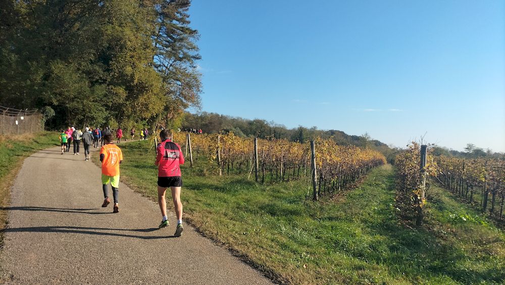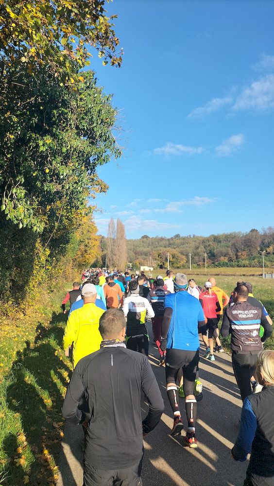 11 km e la mezza maratona sui 21 km. Andrea e Gabriella in preparazione alla prossima Venice optano per un 21 km “di mantenimento” mentre tutti gli altri vanno per il percorso intermedio. Tracciati prevalentemente su strada asfaltata salvo qualche breve tratto di sterrato. Voto alla corsa e