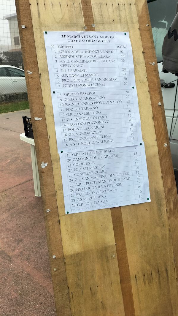 Domenica 17 novembre ed evento podistico di gruppo organizzato presso Anguillara V.ta (PD) dove è andata in scena la 35°ma edizione della “Marcia di S.Andrea”, non competitiva con organizzazione a cura del gruppo Liberi Podisti Anguillara V.ta. Per i nostri ritrovo ore 7:30 con presenti Andrea, il Gianni con Tecla. Direttamente in loco, sotto l’attenta regia del maestro Vittorio, a timbrare il cartellino Federico, Fabio, Andrea the Slicer, Alberto e le mantidi del Capiteo Angela, Betta, Cristina e Barbara. Giornata dal meteo quasi invernale con nebbione da affettare col coltello e temperatura intorno ai 5° C. Tre i possibili percorsi di 6 km, 12 km e 18 km tutti sviluppati intorno alle zone campestri circostanti il centro paese. Buon numero di partecipanti e 30 gruppi podistici iscritti all’evento. Ristori nella norma. Meritata premiazione di gruppo anche per i nostri colori con cassone di patate dolci e mele già destinate alla produzione dolciaria per allietare la prossima riunione di gruppo. Voto alla corsa e all’organizzazione 7. Alla prossima.